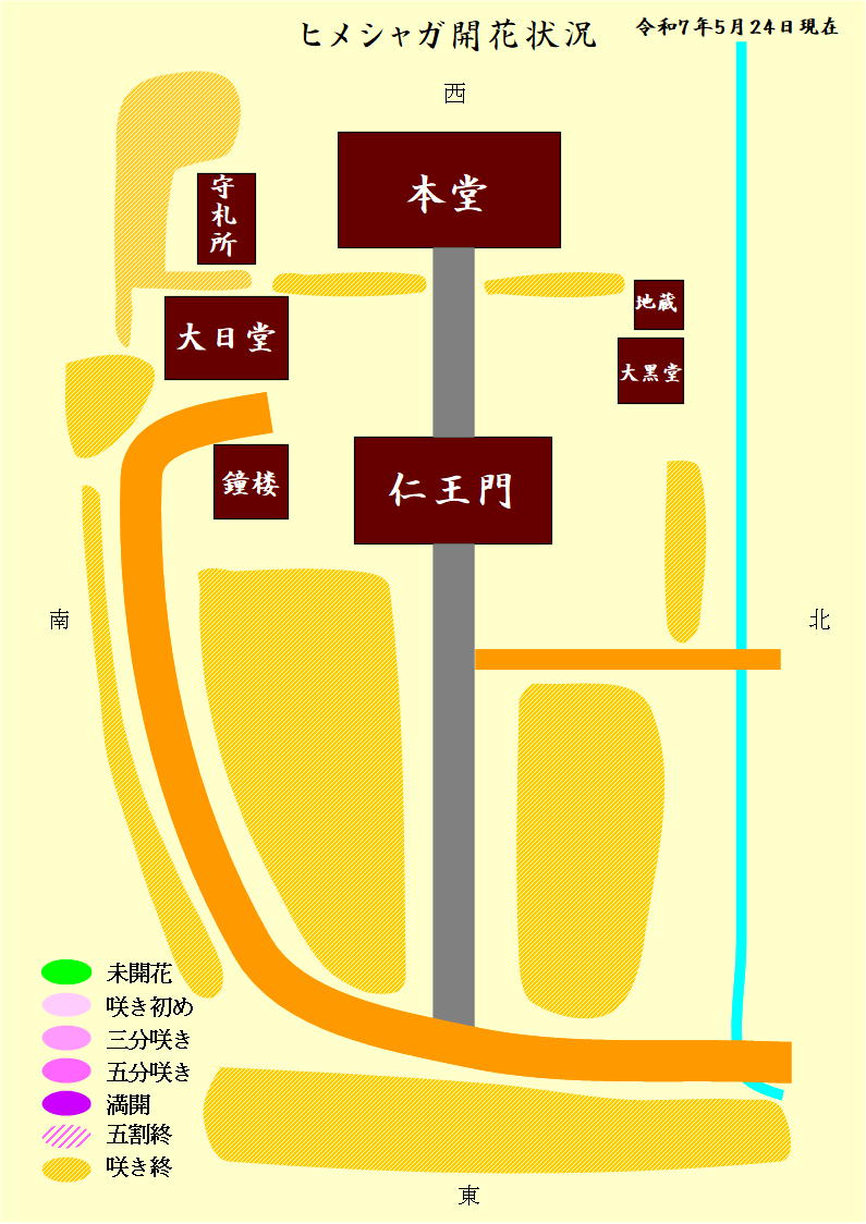 令和7年 花の見頃( 5月 5日〜 20日?) 開花状況 5月24日現在 開花状況 境内図